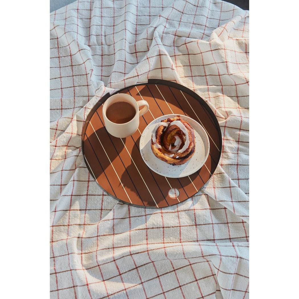 Unser Oka-Tablett ist praktisch und schön zugleich. Das Tablett besteht aus pulverbeschichtetem Metall und wird mit einer haltbaren Silikonmatte geliefert. Wir empfehlen Ihnen, das Tablett mit einem feuchten Tuch zu reinigen.
